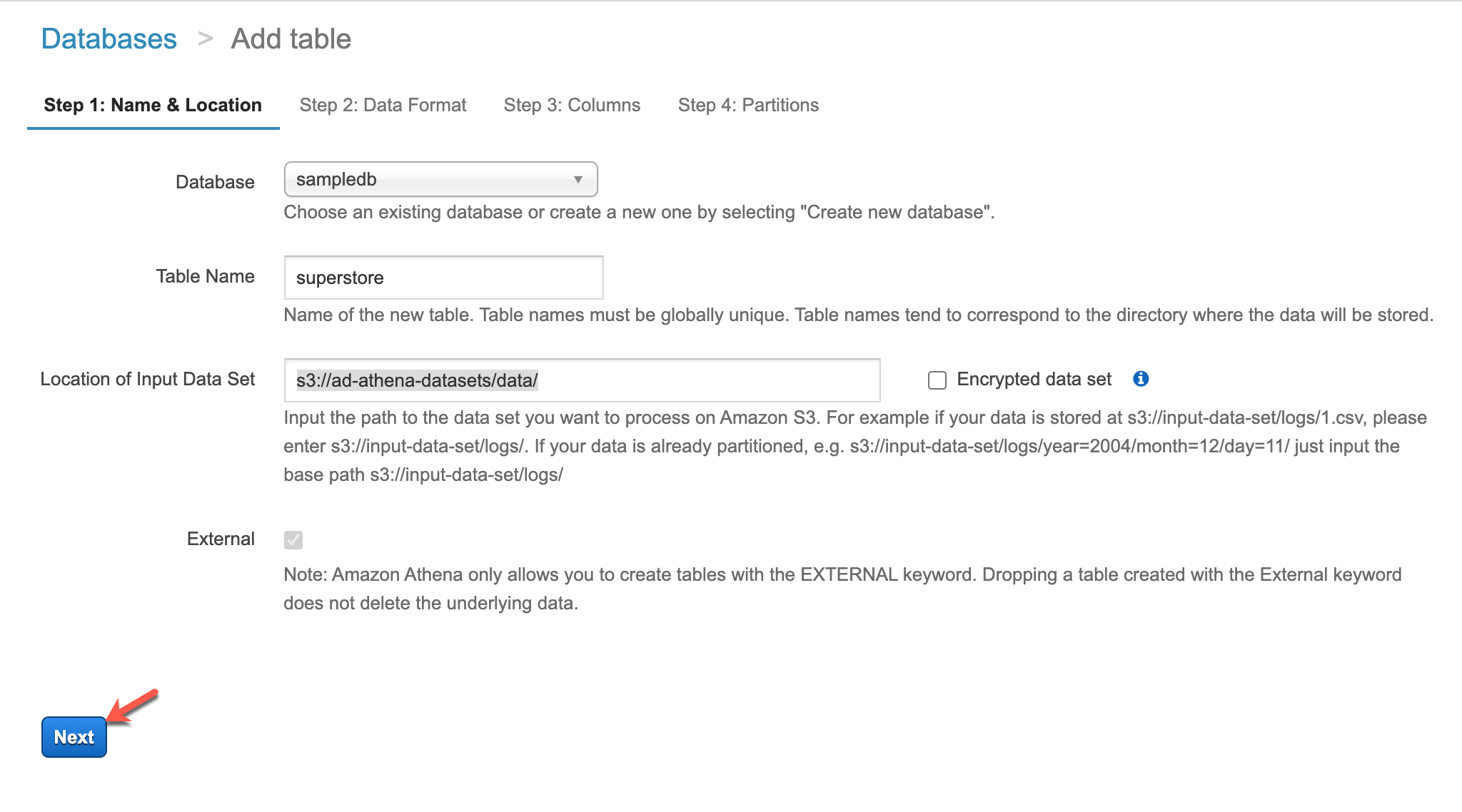 Finally, we need to provide the location of the data file that we are going to query using Athena. This is the S3 URI of the folder under which your files are placed. An important point to note here is that we are not supposed to provide the ARN of the file. Instead, we should provide the location of the next higher level directory in which the file resides. In our example, the file resides in the bucket “ad-athena-datasets“, under the directory “data“. So the location that is to be provided here is “s3://ad-athena-datasets/data/“. Click on Next once done.